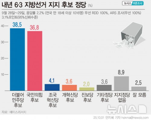 내년 지방선거 지지후보…민주 38.5%·국힘 36.8%, 오차범위 내[창간특집 여론조사] 작성자관리자 등록일 25-10-01 조회22회 출처 뉴시스 보도일자 25.10.01 본문 https://n.news.naver.com/mnews/article/003/0013516788?sid=100 차기 대통령 적합도…장동혁 18.3%, 김민석 14.3%, 조국 12.4%[창간특집 여론조사] 민선 8기 안동시, '잘하고 있다’ 68%...시민 10명 중 9명은 '살기 좋다' 목록